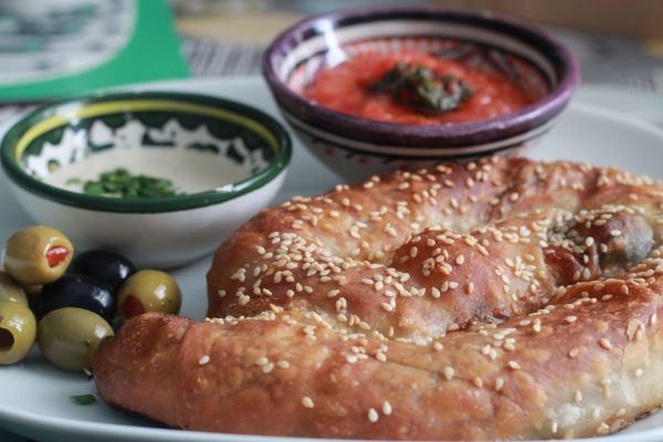 Baked Turkish-style filled pastry, served with a fresh grated tomato salsa, and homemade pickles. A choice of meat, veggie or vegan available