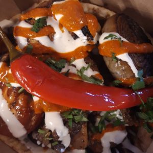 Chicken shawarma served with hummus, tahina, fries, a whole pickled chili, grilled tomatoes and onion, drizzled with a lemon pickle sauce and 2 mini pitta on the side (VG)